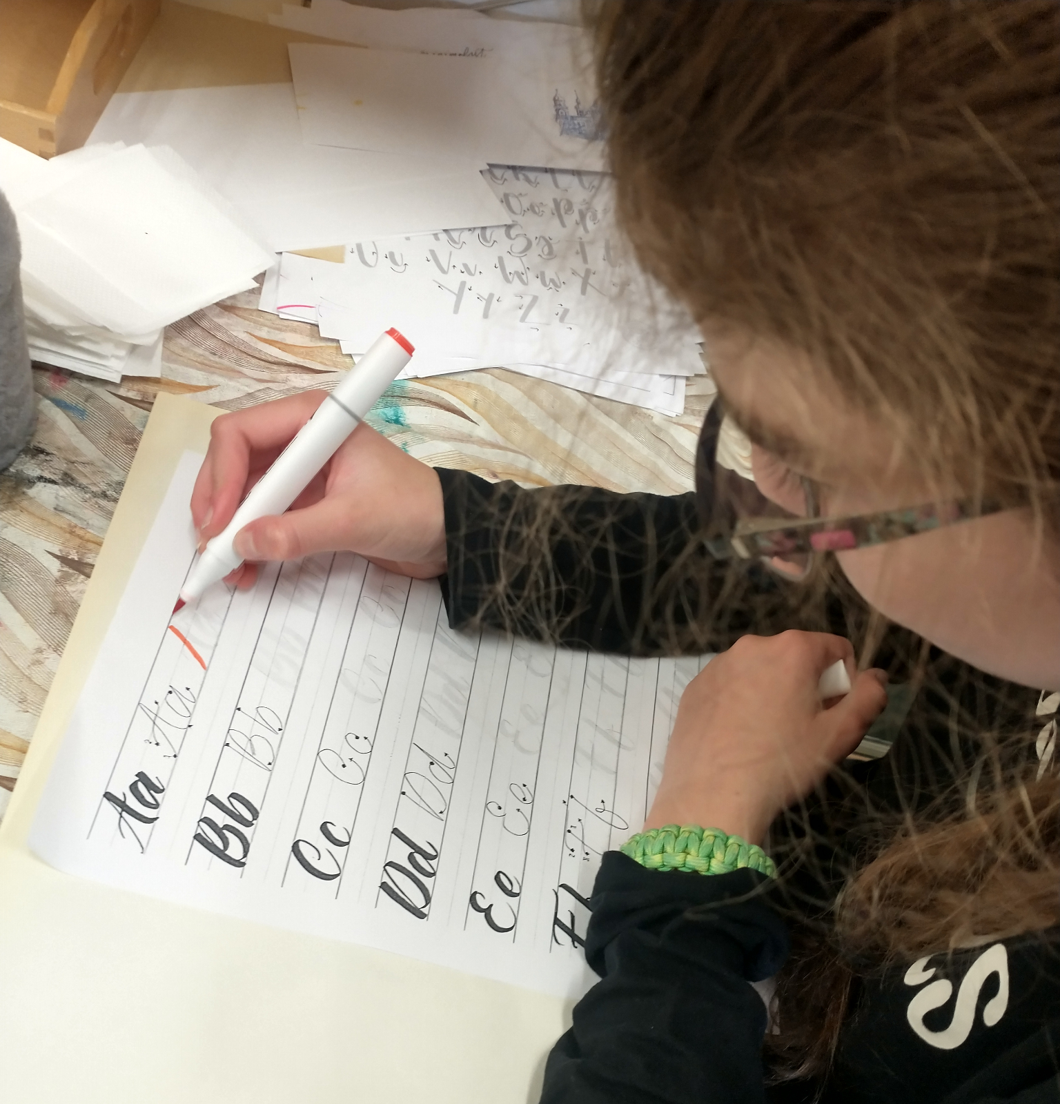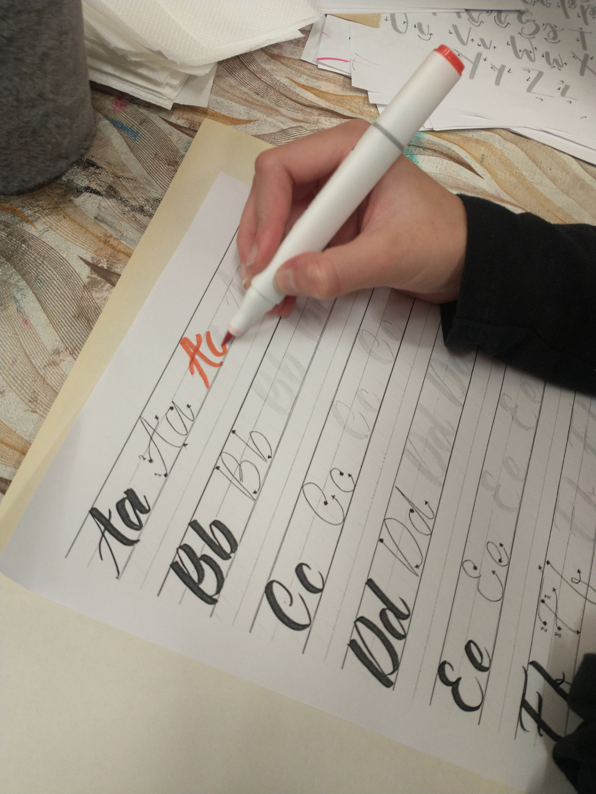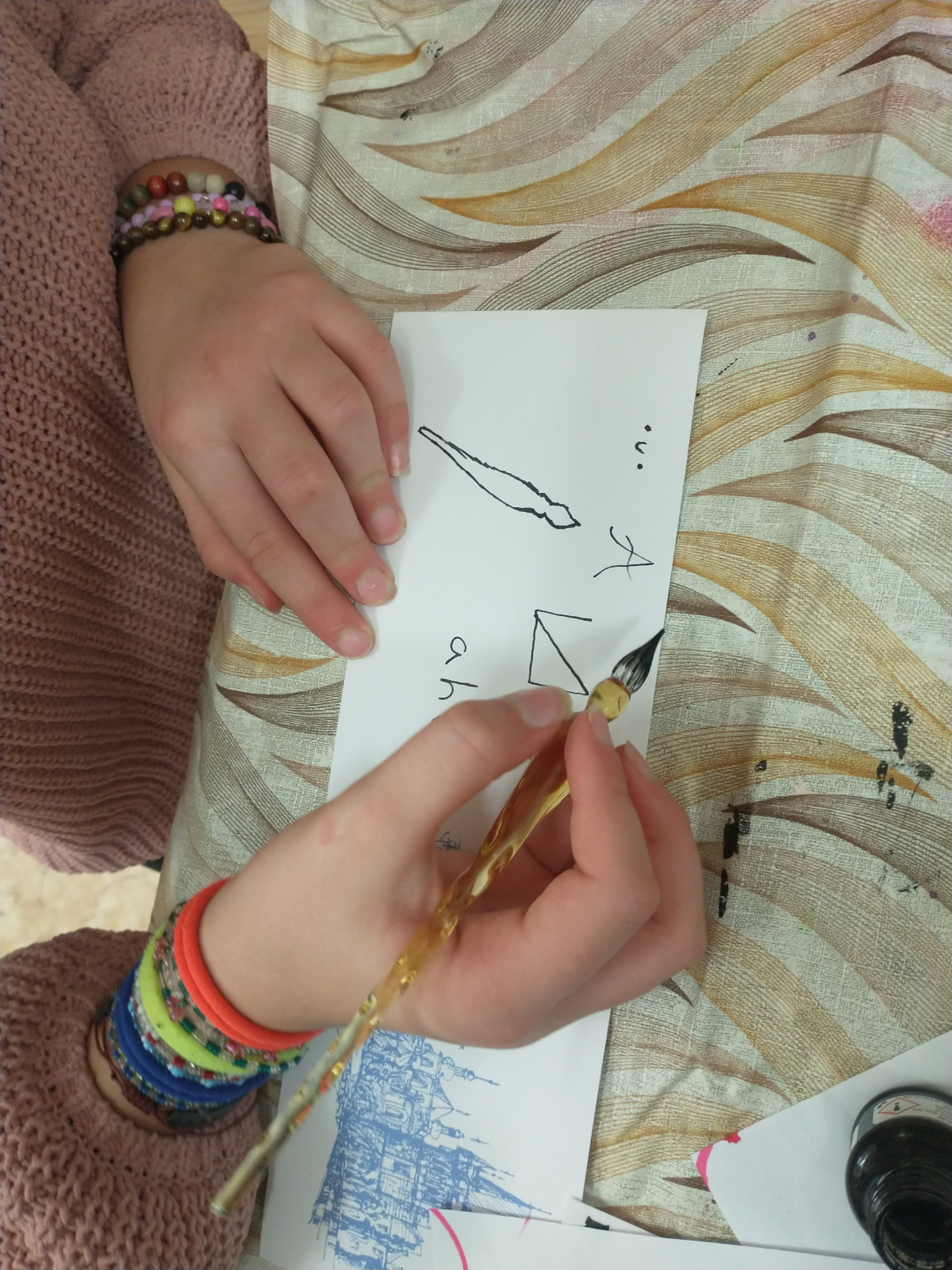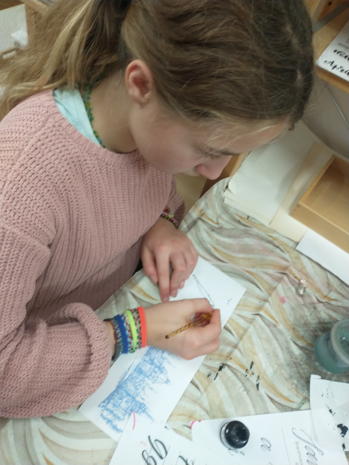 Pokud si chcete vyzkoušet psát krasopisně, ve druhém trojročí můžete. Vedle azurové třídy najdete stolek s papíry a skleněným perem. Než se ale pustíte do práce, přečtěte si pravidla – bývají vedle pera.